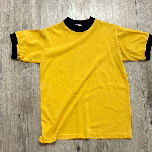 Bright yellow ringer tee from the 80s yellow and navy blue would fit a small in mens