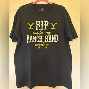 Embrace casual style with the Yellowstone black tee featuring bold yellow ranch hand graphics. Perfect for everyday wear.