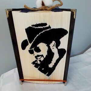 In case you need a little Rip in your life, hanging out on your shelf, displayed handsomely staring back. The book sculpture was handmade using a damaged, tossed away hardcover book. All 500 pages were meticulously measured, marked, cut and folded with strips of black cardstock inserted to create this image. Decorative touches finish it off. 1 of a kind.