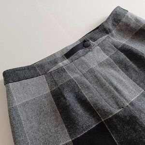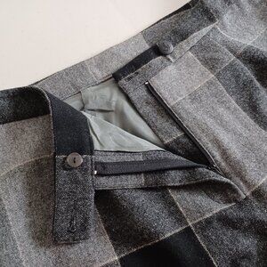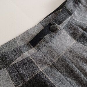 A unique pair of high waist, wide leg pants in a grey large check plaid pattern. Made from a lightweight wool blend, they’re also lined for added comfort. The material drapes beautifully and helps wick away moisture. This means you’ll remain comfortable in warm weather and cozy during chilly days. They’re designed without pockets or belt loops for a seamless, polished look. Perfect for all seasons. New with tags. Excellent condition.