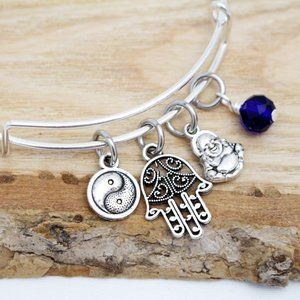 Yin Yang, Hamsa & Buddha Adjustable Charm Bangle - Handcrafted Hypoaller…