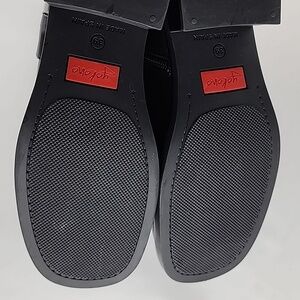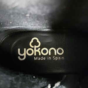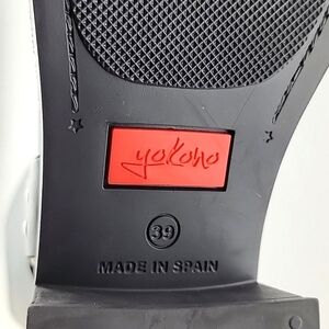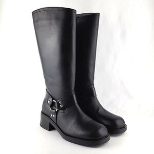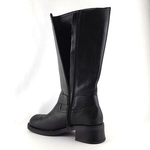 New with tags, Yokono Women's tall black leather riding biker boots with strap and buckle ankle feature and full side zip to easily put on and off, size 39. Made in Spain.
