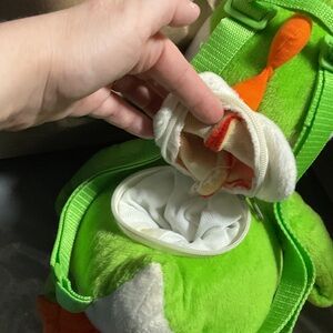 Adorable green and white dinosaur plush toy with orange feet. Perfect for cuddling or carrying around small items.