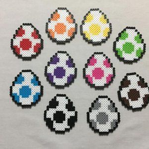 Set of 10 handmade Yoshi egg fridge magnets, each egg measures approximately 2.75" wide x 3" tall x 5mm.