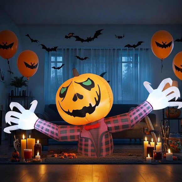 Halloween Pumpkin Inflatable: Our inflatable pumpkin ghost with claws will be a big hit with tricker or treaters on your Halloween party. The scary pumpkin head in check pattern jacket, sticking out his ghost claws, looks awesome and very cool. Set it up in your yard to create a strong festive atmosphere.