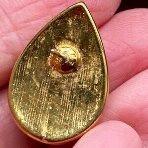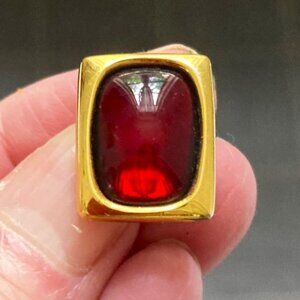 Signature Monet style, likely from the 80s, made in glass and gold tone metal. The faux pearl teardrops are about 7/8 inch long, while the translucent red rectangles are about 2/3 inch. Both marked Monet on the back, around the post. One pair has butterfly backs, the other plastic discs. In very good shape, with the glass parts unmarked. One of the teardrop posts has a wee bend near the tip, which could likely be straightened, but in any case doesn't cause a problem with putting the back on.