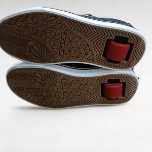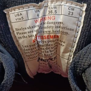 Heelys black and white skater shoes, youth size 5. These shoes are in excellent condition, perfect for young skaters or anyone looking for a stylish and fun way to get around. Comfortable and durable, these Heelys are ready to roll. Don't miss out on this great deal. Includes heel plugs and tool. Unisex. Low Top Lace Up.