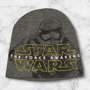 Cozy gray beanie featuring Star Wars Stormtrooper The Force Awakens print with yellow and white lettering. Perfect for young fans. Acrylic knit. 17” in diameter, 8” in length.
