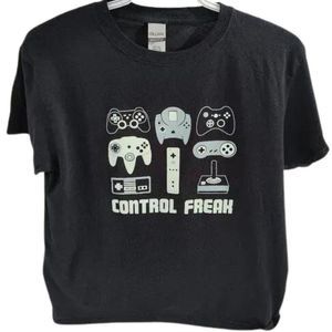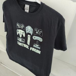 This is a Gildan Youth Gaming "Control Freak" Printed T Shirt. It is Black and the wording and graphics being slightly off-white. This is a perfect shirt for your teen gamer who is always playing games. It fits their personality perfectly. It is in nearly new condition as you can see by the Gildan Tag being exquisite.