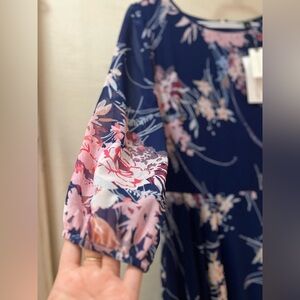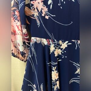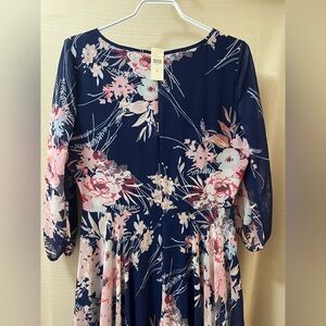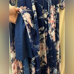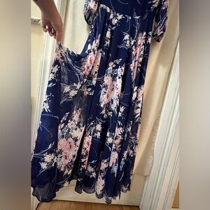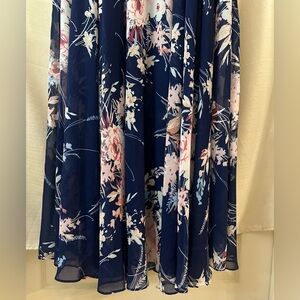 This stunning gown by Yumi Kim features a flowing maxi length in a captivating blue with pink floral accents. Designed with a crew neck and elegant 3/4 bishop sleeves, it's perfect for many occasions. The skirt is particularly flowy which creates a beautiful silhouette.