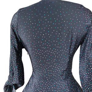 Elegant black midi dress with colorful polka dots. Features a flattering V-neck and long sleeves. Perfect for any occasion.
