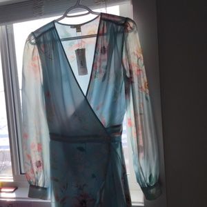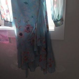 Beautiful flowy spring/ summer party dress, midi length, crossover V neck bodice and ruffled hem, self tie belt, lined with sheer sleeves. Pale blue with pink and coral floral pattern. Never worn.NWT