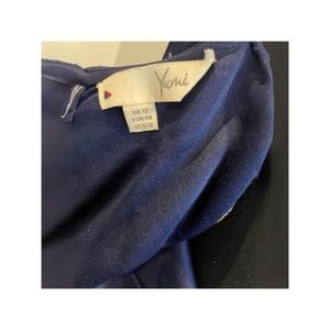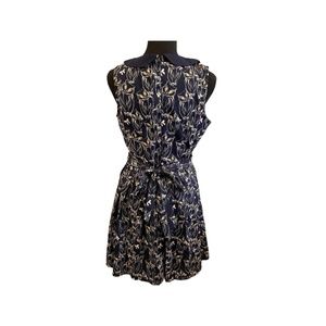 Navy blue Yumi fit and flare dress with pleated skirt, navy collar, and tie waist. Print is outline of white bows and white owls with yellow eyes.