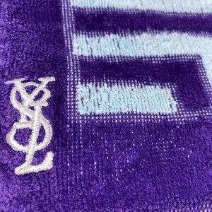 Elevate your bathroom with the vintage charm of a Yves Saint Laurent fingertip towel. This elegant piece, crafted from soft cotton, is adorned with a striking geometric pattern in a vivid purple and blue palette, adding a splash of color to your space. Designed to complement any modern or classic bathroom decor, the towel measures 15 inches in length and 11 inches in width, ideal for daily use and easy handling.