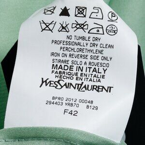 This exquisitely shaped sculpture of a blouse from Yves Saint Laurent in mint green 100% silk organza is an icon. It features long sleeves, a side slit at each hip for ease of movement, and curved sculptural seams that shape the blouse.