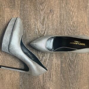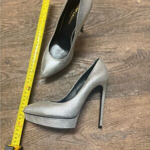 Yves Saint Laurent size 38.5 (8) heels in metallic silver. Ideal for a glamorous night out ultra lux as with everything sold or currently in my closet 1000000 auth- please feel free to review sold for my ultra lux items- in the event you are a scammer(so sorry I have to write this) I won’t just deal with Posh I will direct all info to rcmp) sad that I do have to clarify! These have minor markings and have been worn a handful of times!