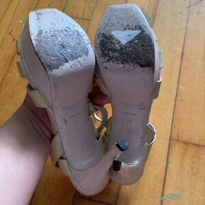 Step into elegance with these Yves Saint Laurent cream heels, featuring a sophisticated strappy design and a sleek stiletto heel. The 1-inch platform adds comfort and height, making them perfect for formal occasions. Crafted with a matte finish, these heels are a versatile addition to any wardrobe.