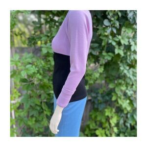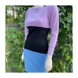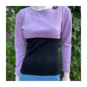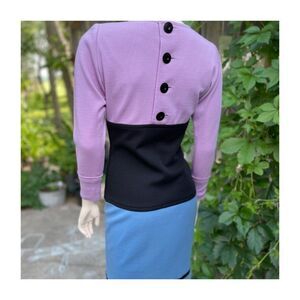 Elegant Long sleeve 100% Wool Knit dress in a Lilac, Black and Blue color block pattern. Rounded neckline. Large rounded button-up closure to rear upper back and left side zip access. A thinly padded shoulder gives a power shoulder structure. Left side bodice near the shoulder features a studded attached broach that is sewn in. The broach shows wear to stones and may have been repaired at some point. No stains, holes or tears. No strong odors. Pet and smoke free studio.