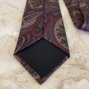 Absolutely gorgeous power tie from Yves Saint Laurent in 100% silk. Features an elegant and timeless paisley print in rich tones that include burgundy/purple, grey, green… stunning piece!