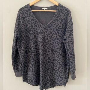 Women’s cheetah animal print dark grey on grey raw curved hem side slit lounge v neck sweater