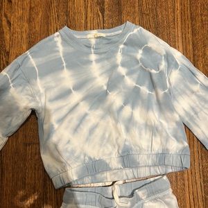 Gently worn blue and white tie dye sweatsuit. Tiny dirt mark on leg (see pictures).