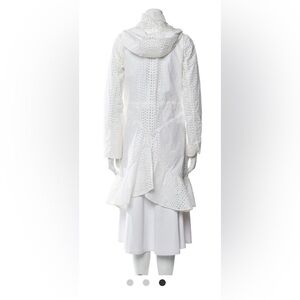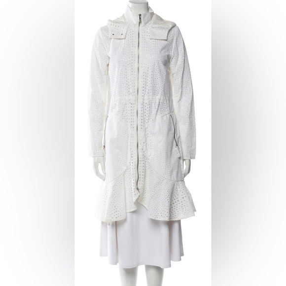 Chic white trench coat with eyelet design. Features stylish ruffled hem. Ideal for elegant layering.