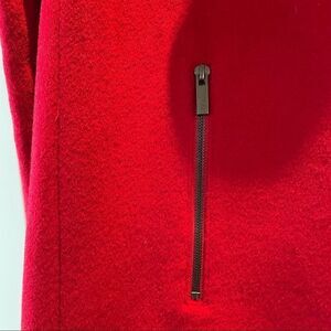 Has oversize notch collar with asymmetrical zipper and dropped shoulders . Front zip pockets and fully lined.