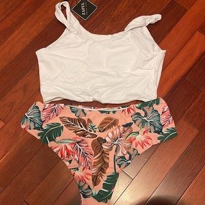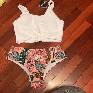 Zaful Bikini set White scoop neck top Pink leaf print bottom Size M/ US 6