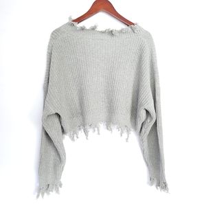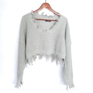 Cropped sweater featuring v-neckline,long sleeve,ripped trims around the collar, sleeves and hem