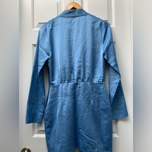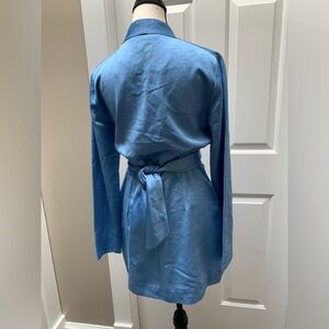 Zara NWT mini dress in blue satiny fabric with a wrap tie belt Side zip 29.5” long approximately
