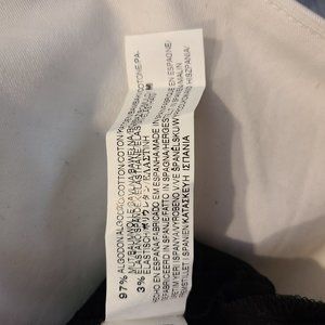 Very stylish! But the dress needs a trip to the dry cleaner (there is a tiny mark on the white on the front left side .... tried to show it in the 2nd photo). Not very noticeable, but want to fully disclose. Fabric has VERY little stretch, so its a slim fit (no zipper ... slip on). Heavy cotton spandex fabric. In excellent pre-loved condition!