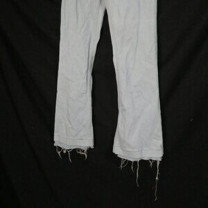 These trendy light blue pants feature a modern flared leg and a raw, distressed hem for an edgy look