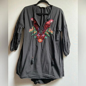 ZARA BLACK EMBROIDERED SEQUIN PARROTS POPLIN JUMPSUIT ROMPER SZ S