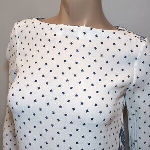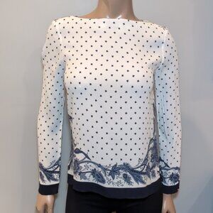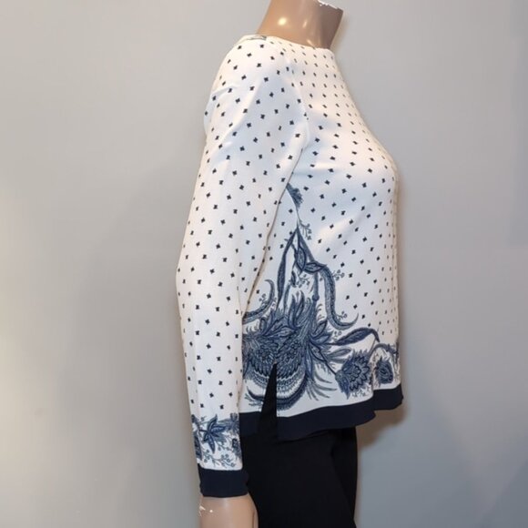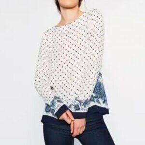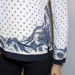 ZARA Batik Print Blouse Long Sleeve Floral Bordered Side Slit Ecru Navy Top