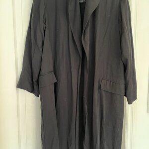Fluid long topcoat with lapel collars and long sleeves. Front flap pockets. Back slit. Closure with belt.