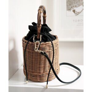ZARA Black & Beige Woven Rattan Straw Crossbody Bucket Bag