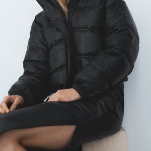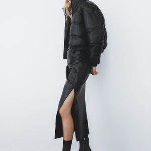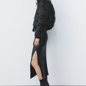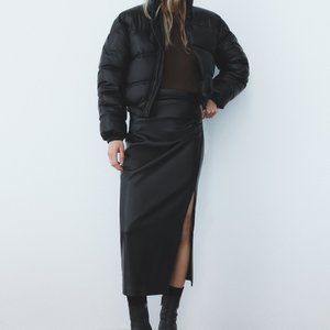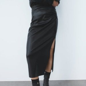 High-waisted midi skirt. Draped fabric. Side slit at hem. Back hidden in-seam zip closure.