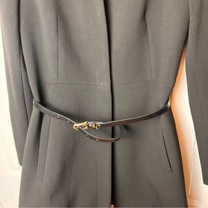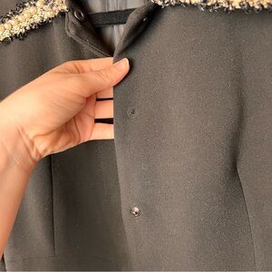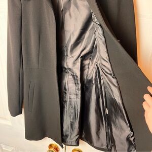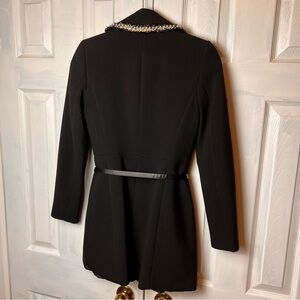 Classic structured A-line black blazer frock coat with pearl collar. Can be worn open or closed with an attachable belt. Approx. upper thigh length. Perfect for Fall!