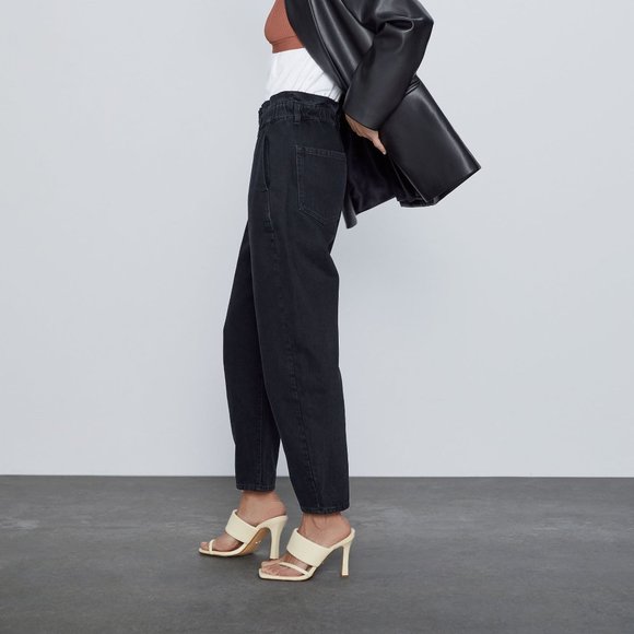 ZARA Black High Waisted Baggy Ankle Length Paperbag Jeans | Size 02