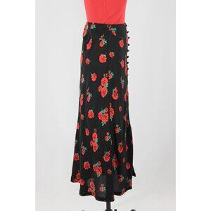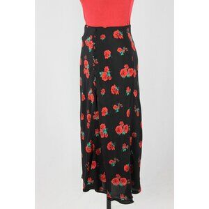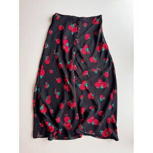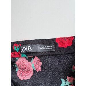 ZARA Black Rose Print Button Front A-Line Midi Slip Skirt, Size XS