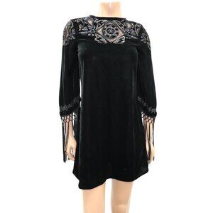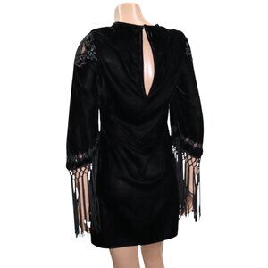 ZARA Black Velvet Embroidered Beaded Embellished Mini Dress Fringe Sleeves S
