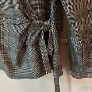 Stylish plaid wrap blouse with tie detail. Perfect for any occasion.
