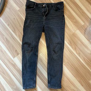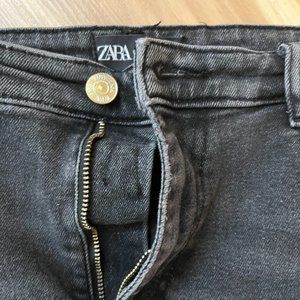 Really nice thick black denim wash jean with a straight leg from ZARA. These have quite a bit of stretch. High waist, comfy, in good used condition. No visible stretching or pimpling of fabric on front near crotch or buttocks of pant. Highly reco if you are looking for a comfy casual jean in a thicker weight denim with stretch.