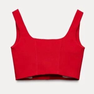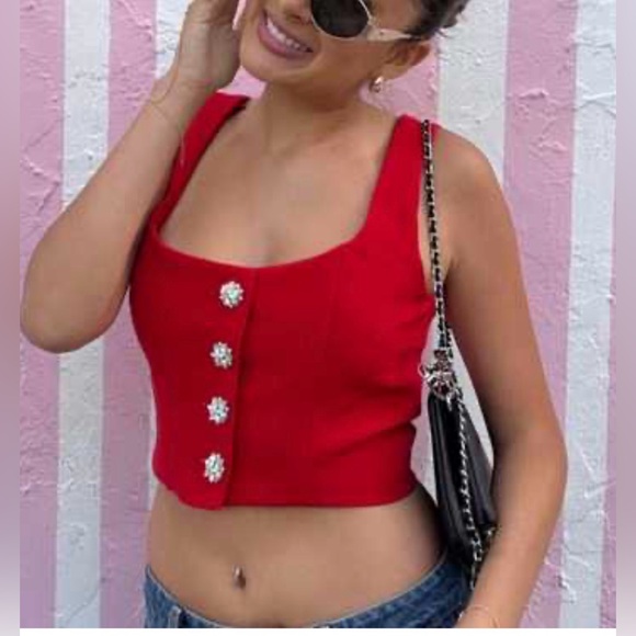Chic red crop top by Zara. Features stylish button accents. Perfect for a bold look.