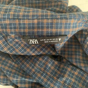 Cropped, elastic bottomed, blue and orange plaid Zara button up. Super cute and versatile, perfect condition, never worn. (I am size 4US in tops for reference).