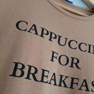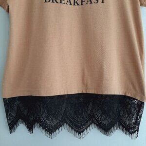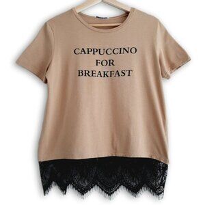 • Short sleeve crew neck tee in ceamy tan with font decal "Cappuccino for breakfast" with contrasting black lace hem.