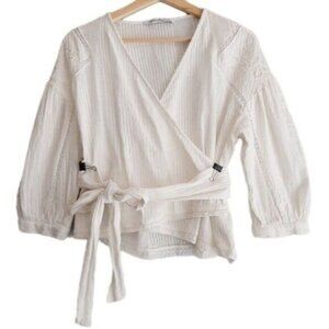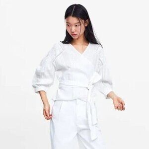 ZARA Cotton Linen Blend Boho Floral Embroidery Wrap Top Sz S