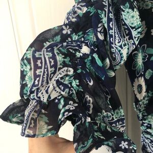 ZARA Blue, short Dress with V-neck and below-the-elbow length sleeves. Draped Fabric, flounced hem. Hidden in-seam side zipper closure.
