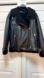 The jacket includes an asymmetrical zip closure, a belted hem with a buckle, and buckled tabs on the cuffs and collar. It also has two front zip pockets