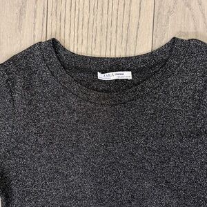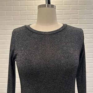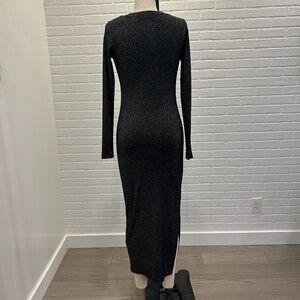 Maxi dress in Black/Silver Lurex ribbed jersey. Crew neck with long fitted sleeves. Length ist 50" from highest shoulder point with side slit on right of leg. Is easy to wear and can be dressed up or down.
